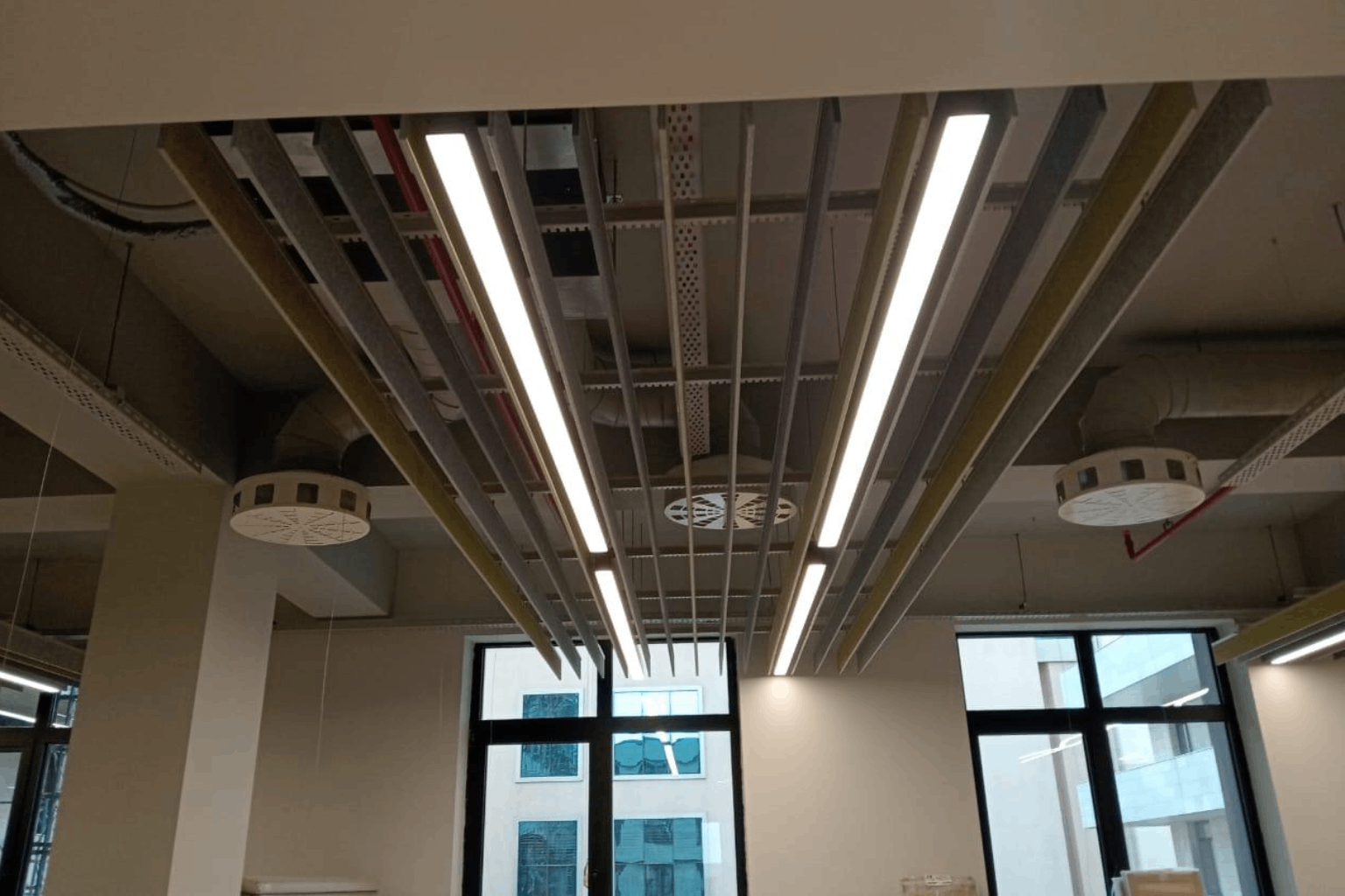 Aesthetic and acoustic solutions were achieved through the installation of suspended ceilings and baffle systems, ensuring visual consistency and functionality in interior spaces.
